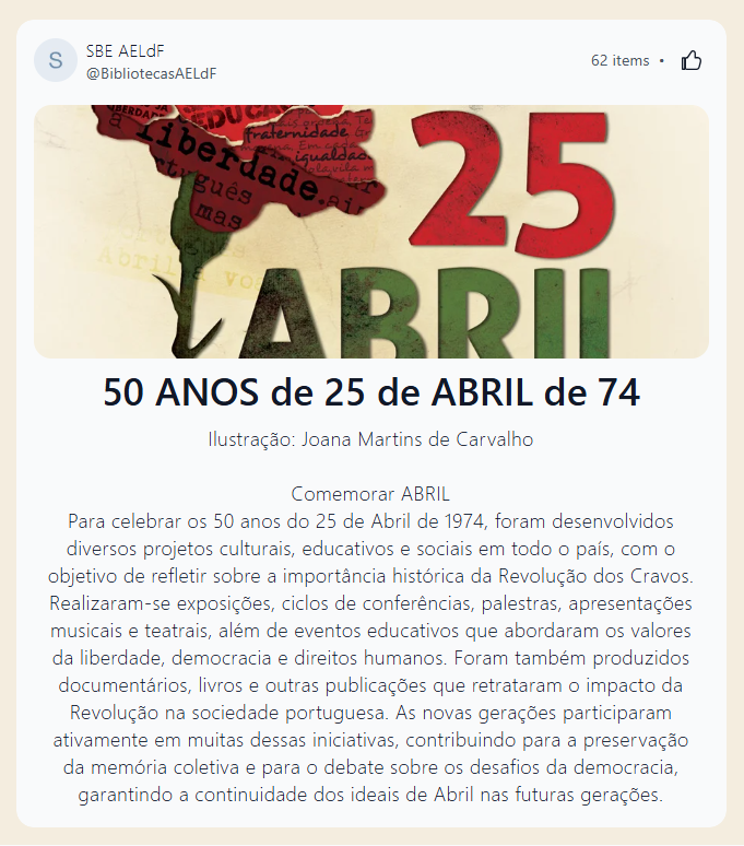 Exposições. Concertos. Representações teatrais. Cinema e documentários. Música. Edição de moedas comemorativas. Estes são alguns dos eventos com que nos últimos meses se assinalou os 50 anos do 25 de abril de 74. Curadoria da Biblioteca Escolar Clara Póvoa.