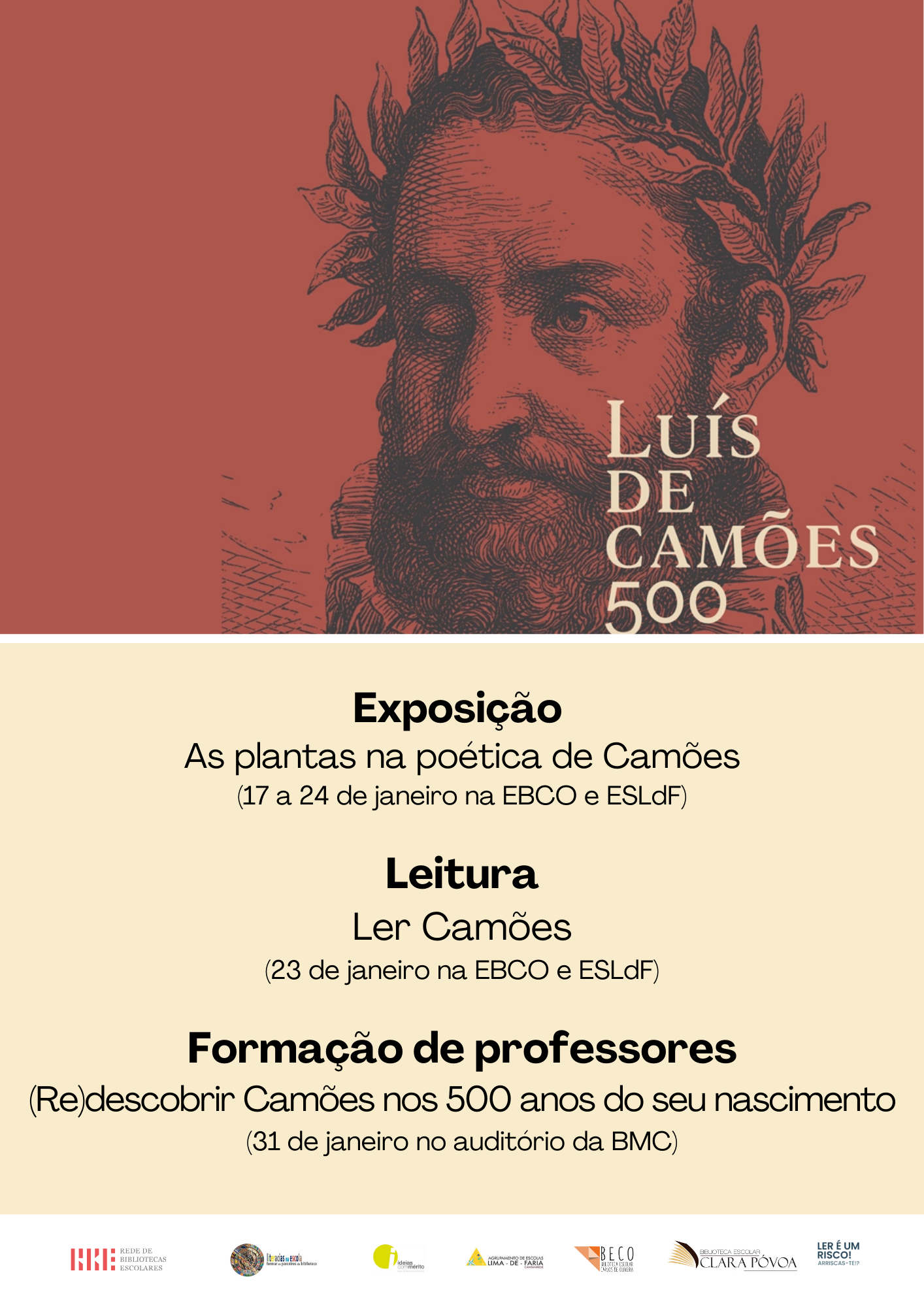 Formação de professores (Re)descobrir Camões nos 500 anos do seu nascimento, por José Bernardes, a decorrer no dia 31 de janeiro, das 14h30 às 17h30, no auditório da Biblioteca Municipal de Cantanhede.