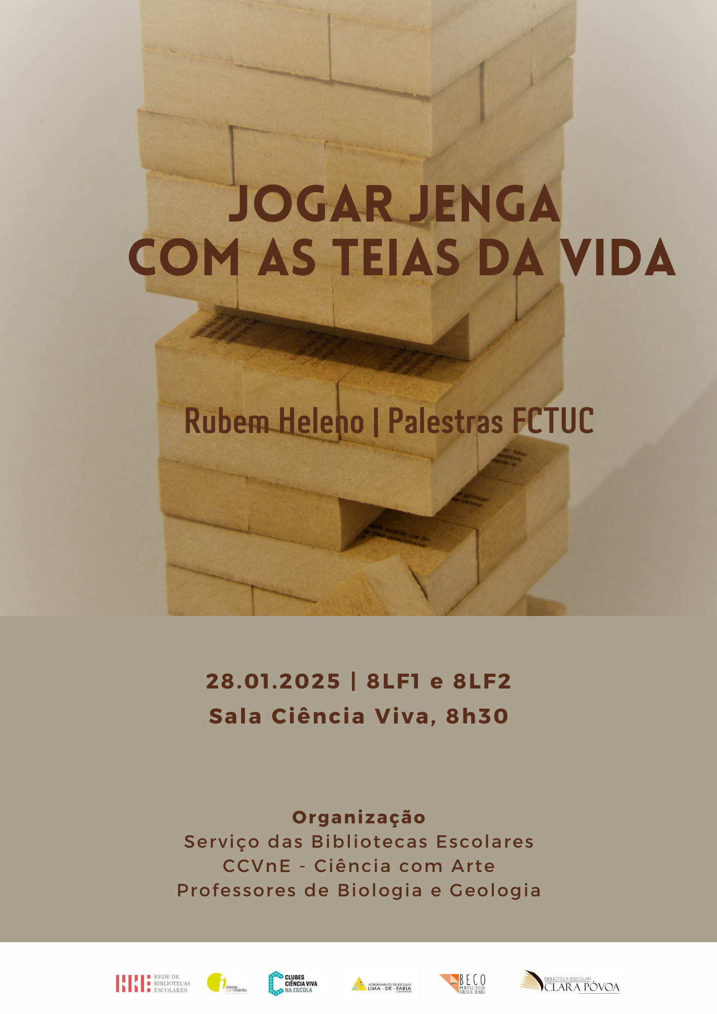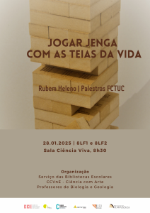 28.01.2025 – Jogar jenga com as teias da vida. Palestra FCTUC, integrada no Cientificamente Provável (RBE) e no Clube Ciência Viva na Escola – Ciência e Arte. Turmas do 8.º ano da ESLdF.