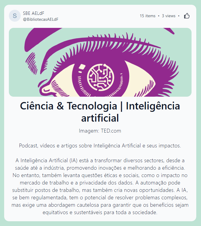Conjunto de recursos em áudio e vídeo, sobretudo em português, disponíveis em linha, sobre Inteligência Artificial (IA). Reflexões sobre o desenvolvimento da IA (limites e potencialidades) e seu impacto social e político. Curadoria do Serviço das Bibliotecas Escolares do AELdF.