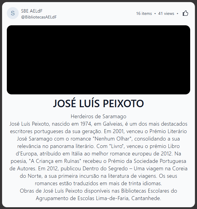 Nota: outros recursos poderão ser acrescentados a este Wakelet, nomeadamente outras obras do autor que possam vir a ser acrescentadas às coleções das Bibliotecas Escolares do Agrupamento de Escolas Lima-de-Faria, Cantanhede.